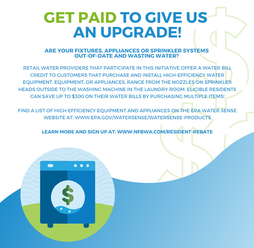 You have the opportunity to receive a credit towards your water bill when you purchase and install high efficiency appliances or water saving items for your landscape! Items range from nozzles on sprinkler heads to the clothes washer in the laundry room.